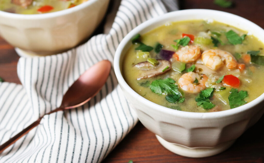 Put the stock, beans, shrimps, vegetable mix and quinoa in a pot and bring to high heat while stirring.